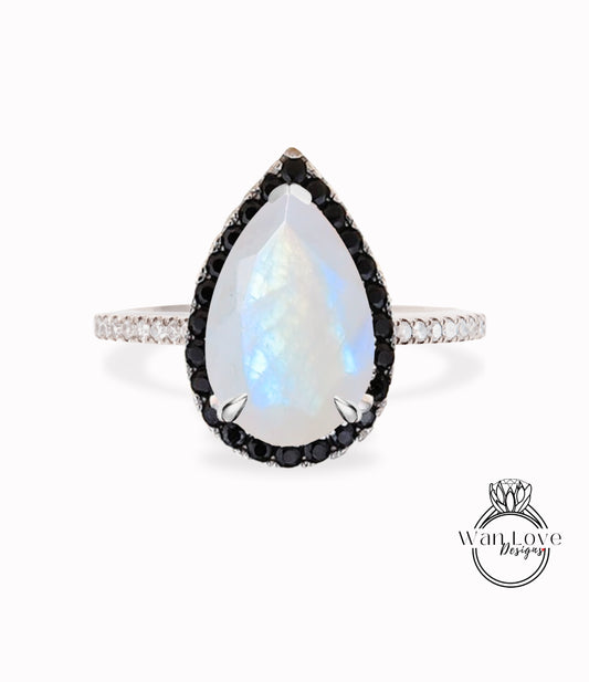 Moonstone & Black Diamond Pear Halo Engagement Ring, Drop Cut, Custom-Wedding, 14k 18k White Rose Yellow Gold, Platinum, WanLoveDesigns