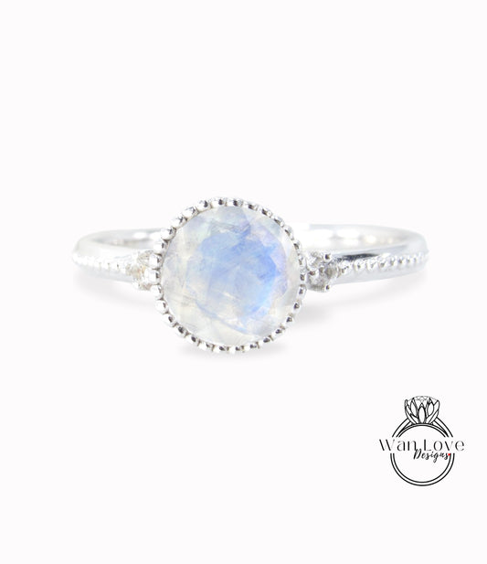 Moonstone Round Diamond Ring, Round Cut Moonstone Ring in Milgrain Bezel Setting, 3 Gem Stone Round Engagement Ring