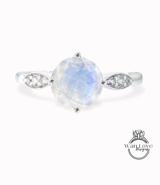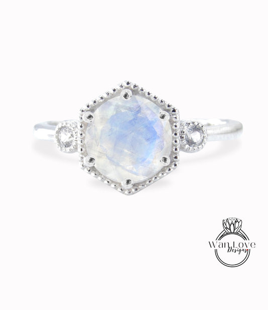 Moonstone & Diamond Hexagon Milgrain 3 Stone Round Engagement Ring, 14k 18k White Yellow Rose Gold,Custom, Wedding, Anniversary Gift