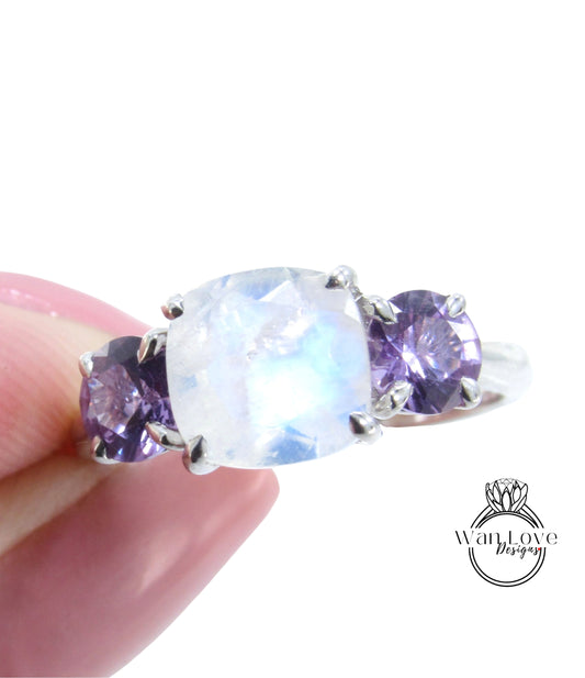 Moonstone Color Change Sapphire 3 Stone Cushion Round Engagement Ring, Custom, Anniversary Gift, 14k 18k White Rose Yellow Gold