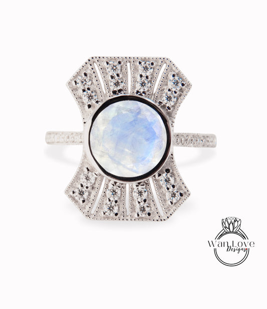 Vintage Moonstone Diamond Engagement Ring, Art Deco halo ring, Milgrain round bezel moissanite ring, Moon Stone ring with Diamonds
