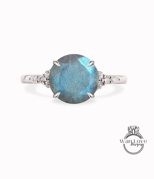 Labradorite & Diamond Round Cluster 3 gemstone thin dainty Engagement Ring, Custom, 14k 18k Gold, Platinum, Wedding, WanLoveDesigns
