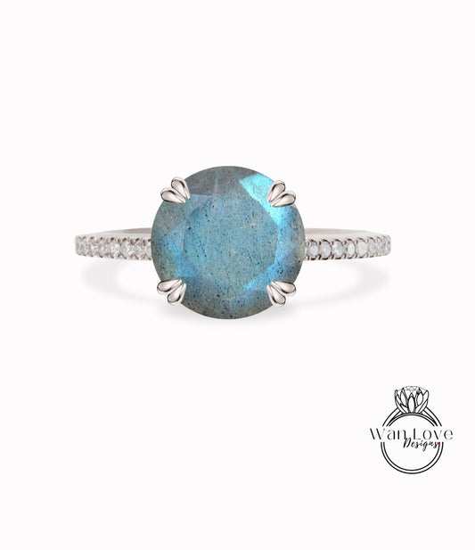 Labradorite & Diamond Engagement Ring-Thin Shank-Basket-Round 14k 18k White Yellow Rose Gold-Platinum-Custom-Anniversary Gift
