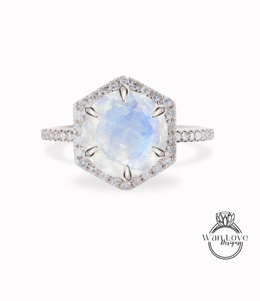 Hexagon Halo Moonstone engagement ring Round cut diamond halo ring half eternity vintage art deco rose gold ring anniversary promise ring