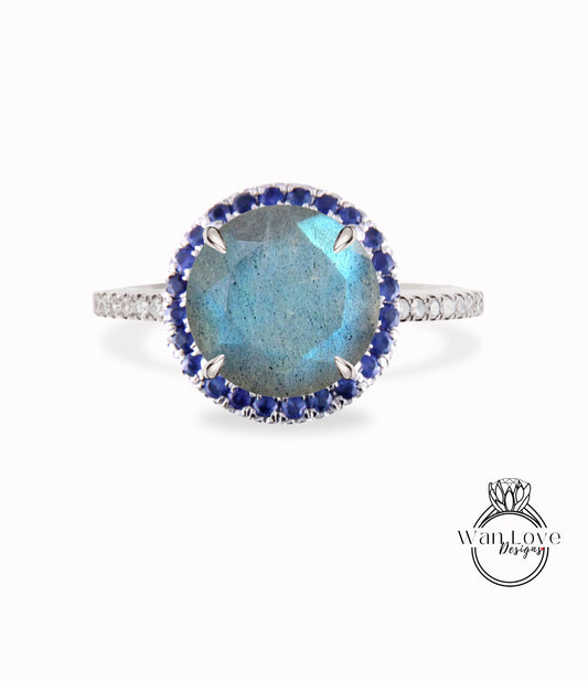Labradorite Blue Sapphire & Diamond Round Halo Engagement Ring, Custom, Wedding,Anniversary Gift, 14k 18k White Rose Yellow Gold, Platinum