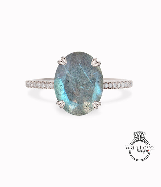Labradorite & Diamond Elongated Cushion Oval Engagement Ring, 14k 18k White Yellow Rose gold-Platinum-Wedding, WanLoveDesigns