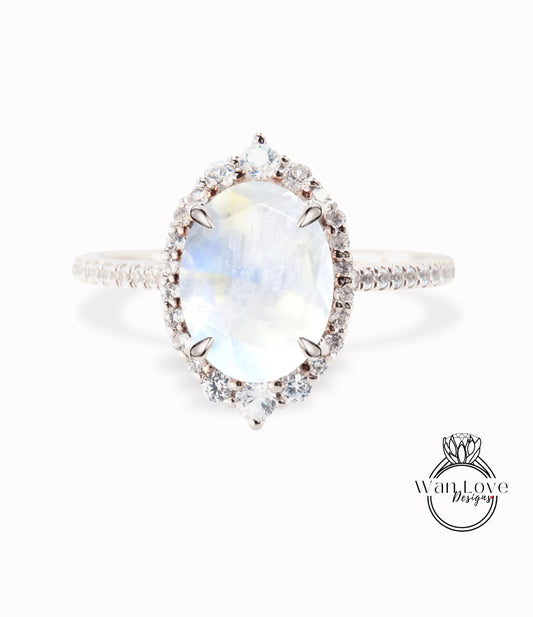 Moonstone & Diamond Oval Halo Engagement Ring 14k 18k White Yellow Rose Gold Platinum Custom made size Wedding Anniversary Rainbow