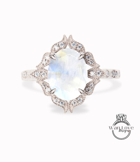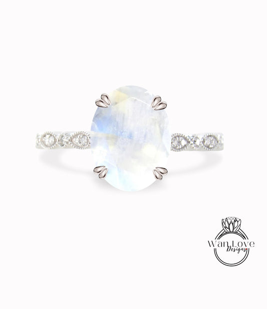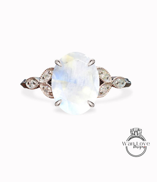 Moonstone Oval Diamond Ring, Floral Diamond Ring with Moonstone, Moon stone Milgrain Ring, Blue Flash Engagement Ring, Custom,WanLoveDesigns