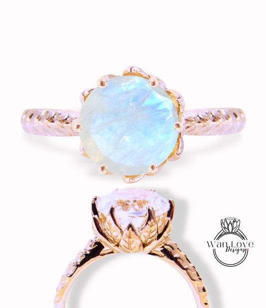 Round cut Moonstone engagement ring vintage Lotus Flower engagement ring woman nature leaf ring Unique Bridal ring Anniversary gift