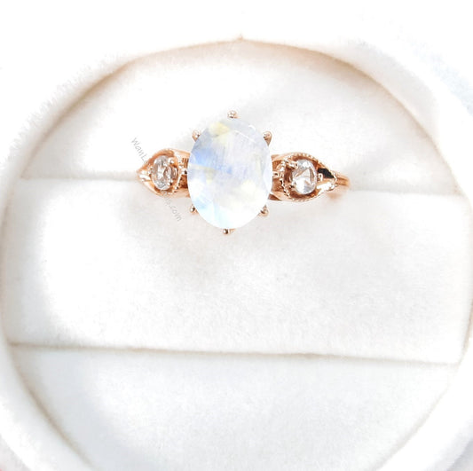 Vintage Oval cut Moonstone engagement ring Rose gold ring Art deco Diamond Milgrain antique wedding Bridal Anniversary ring promise ring
