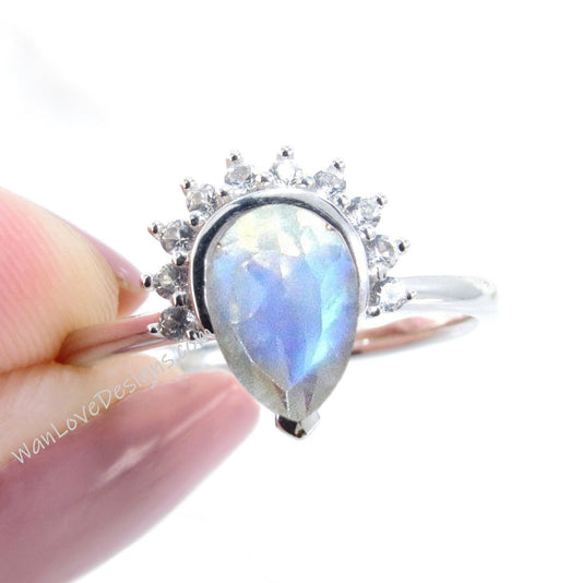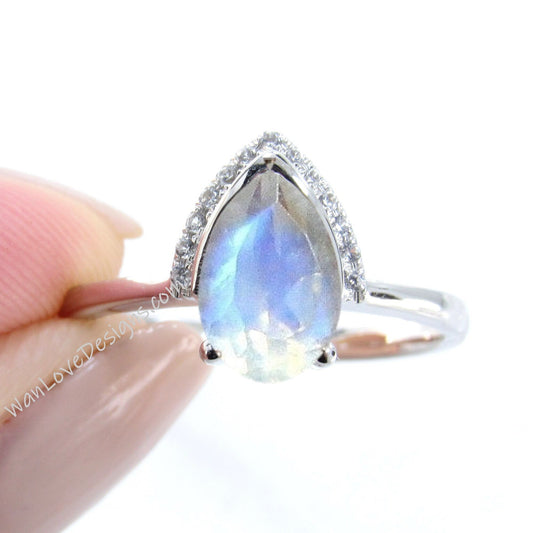 Pear Cut Moonstone Ring, Semi Bezel Ring, Half Halo Diamonds ring, Moonstone Engagement Ring, Moonstone Halo Ring, Rainbow Ring
