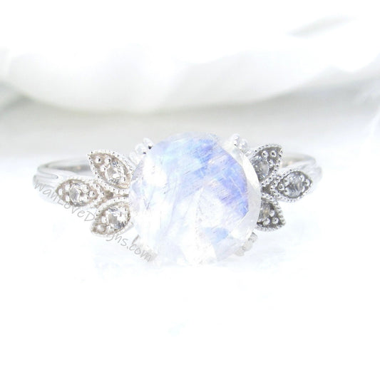 Moonstone & Diamond Engagement Ring, Milgrain Leaf Nature Round Antique Vintage style, 14k 18k White Yellow Rose Gold-Platinum-Custom