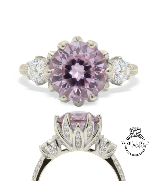 Lavender Amethyst & Diamond Lotus Flower 3 gemstone Engagement Ring, 14k 18k White Yellow Rose Gold-Platinum-Custom-Three gem stone Bridal Wedding Ring-Anniversary Gift