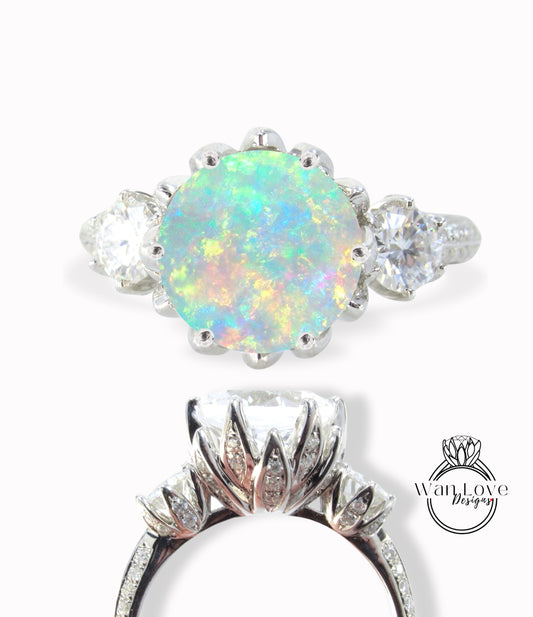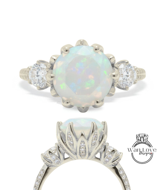 Opal & Diamond Lotus Flower 3 gemstone Engagement Ring, 14k 18k White Yellow Rose Gold-Platinum-Custom-Three gem stone Bridal Wedding Ring-Anniversary Gift