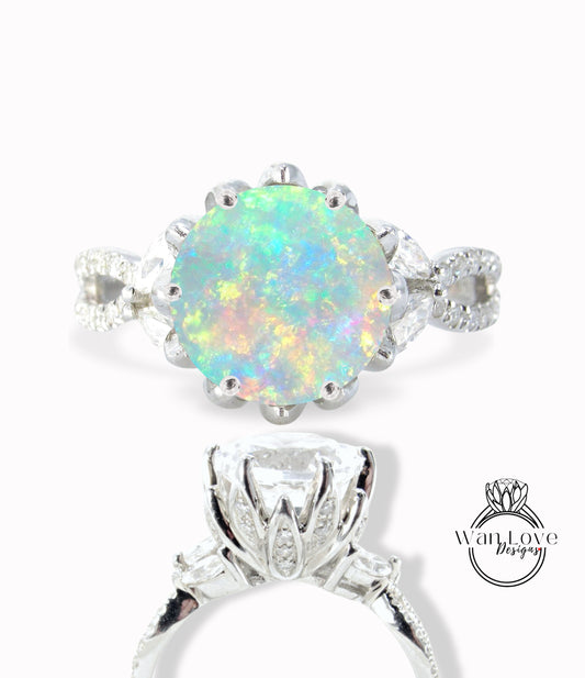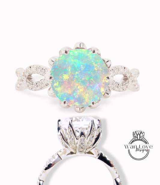 Opal & Diamond Lotus Flower Infinity Twisted Round Engagement Ring, 14kt 18kt Gold-Platinum-Custom-Wedding ring-Anniversary Gift
