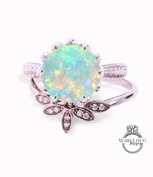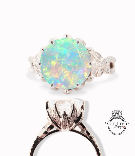 Lotus Flower Opal & Diamond Engagement Ring vintage Round Lotus gold ring unique antique ring wedding bridal promise ring Anniversary gift