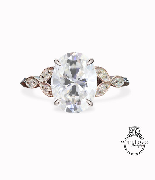 Moissanite & Diamond Oval Leaf Antique Cluster Engagement Ring Engraved Milgrain or Smooth 14kt 18kt Gold Platinum Custom Wedding