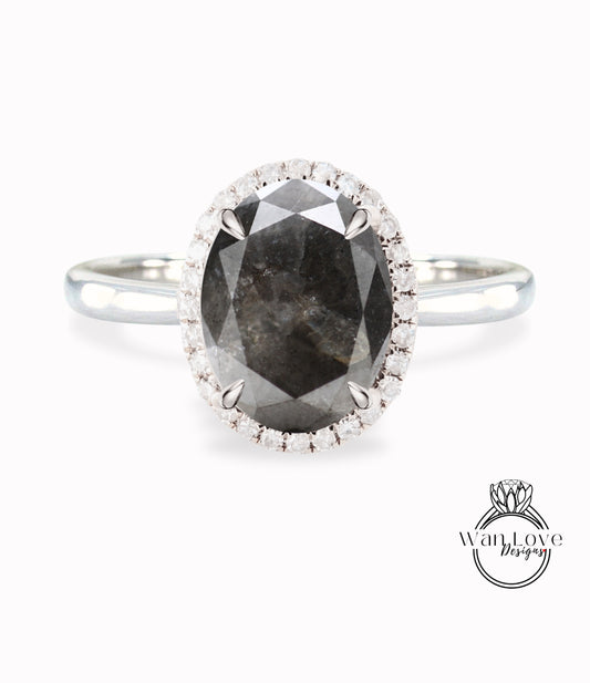 Salt Pepper Diamond Oval Halo tapered plain thin dainty band engagement ring rose gold art deco anniversary gift