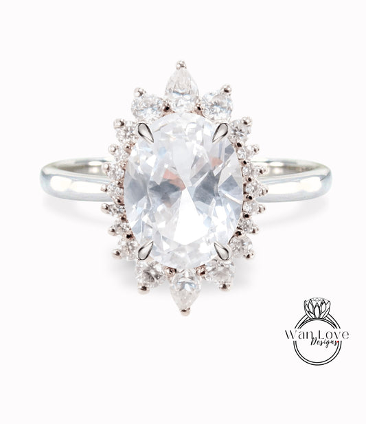 White Sapphire & Diamond Oval Cluster Halo Engagement Ring, Rose Gold Bridal Wedding Ring, Anniversary Gift