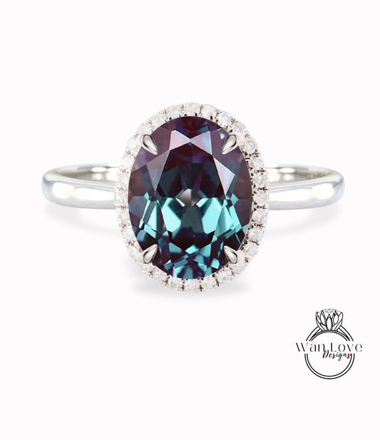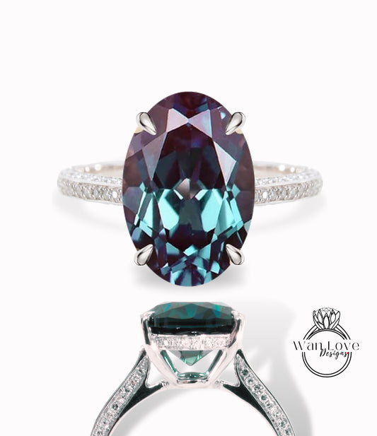 Alexandrite & Diamond Oval side halo 3 sided Almost eternity shank band Engagement Ring 14k/18k Rose White Gold, Celebrity Elongated Oval Bridal wedding Ring, Anniversary Gift
