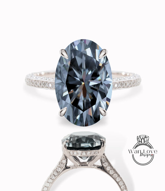 Gray Moissanite & Diamond Oval side halo 3 sided Almost eternity shank band Engagement Ring 14k/18k Rose White Gold, Celebrity Elongated Oval Bridal wedding Ring, Anniversary Gift
