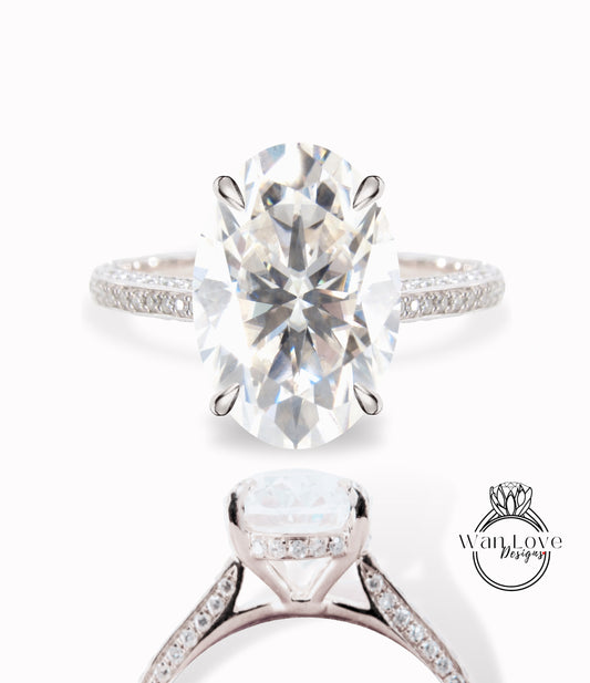 Moissanite & Diamond Oval side halo 3 sided Almost eternity shank band Engagement Ring 14k/18k Rose White Gold, Celebrity Elongated Oval Bridal wedding Ring, Anniversary Gift