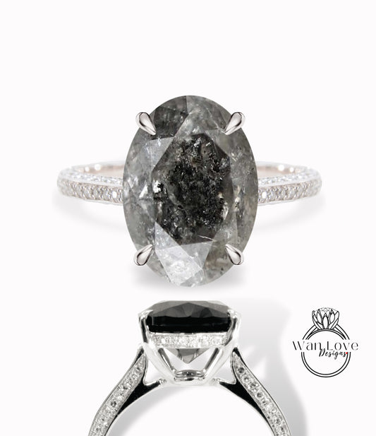 Salt & Pepper Diamond Oval side halo 3 sided Almost eternity shank band Engagement Ring 14k/18k Rose White Gold, Celebrity Elongated Oval Bridal wedding Ring, Anniversary Gift