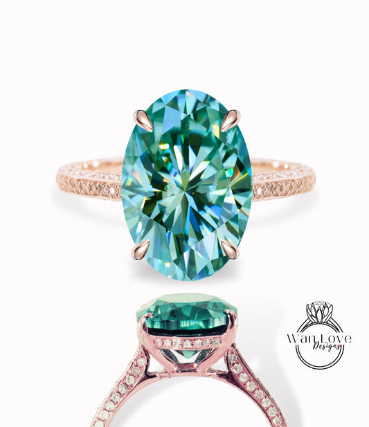 Teal Blue Green Moissanite & Diamond Oval side halo 3 sided Almost eternity shank band Engagement Ring 14k/18k Rose White Gold, Celebrity Elongated Oval Bridal wedding Ring, Anniversary Gift