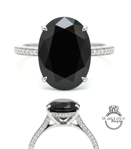 Black Spinel & Diamond Oval side halo 3 sided Almost eternity shank band Engagement Ring 14k/18k Rose White Gold, Celebrity Elongated Oval Bridal wedding Ring, Anniversary Gift