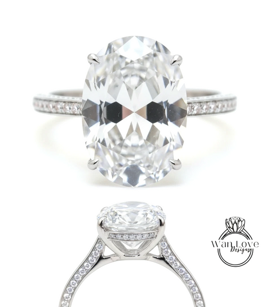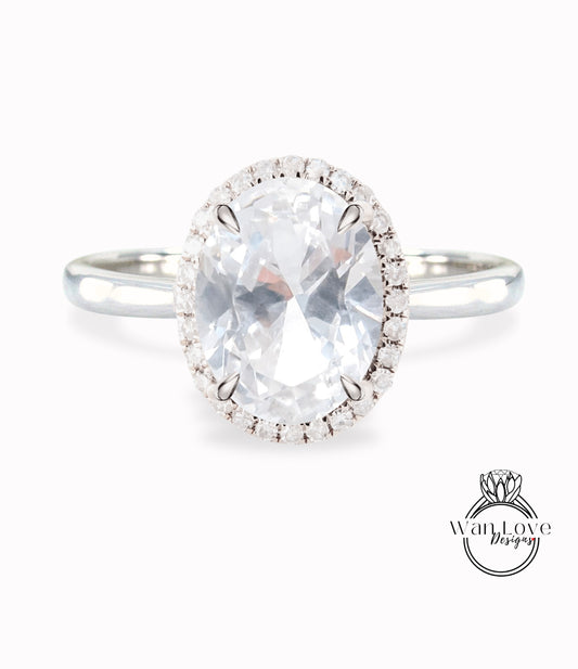 White Sapphire & Diamond Oval side halo 3 sided Almost eternity shank band Engagement Ring 14k/18k Rose White Gold, Celebrity Elongated Oval Bridal wedding Ring, Anniversary Gift