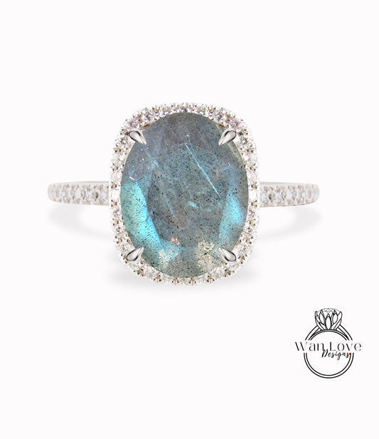 Labradorite & Diamond Elongated Cushion Halo with Oval cut engagement ring gold vintage ring women Half eternity Bridal wedding ring Anniversary Gift