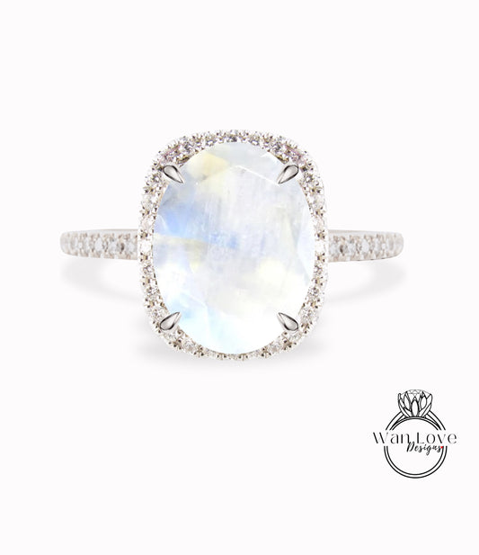 Moonstone & Diamond Elongated Cushion Halo with Oval cut engagement ring gold vintage ring women Half eternity Bridal wedding ring Anniversary Gift