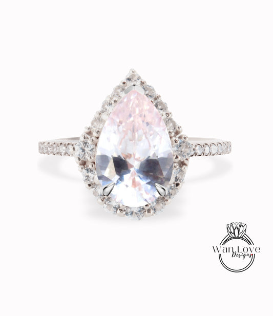 Moonstone & Diamond Graduated Halo Pear Engagement Ring Plain Shank Custom-14k 18k White Yellow Rose Gold-Platinum-Wedding