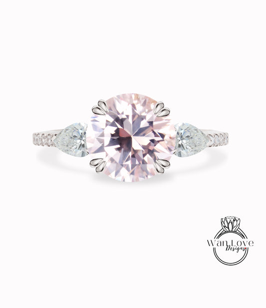 Light Pink Sapphire Round Pear Diamond Ring, Three Stone Moissanite Ring, Round sapphire engagement Ring, Diamond Band Ring