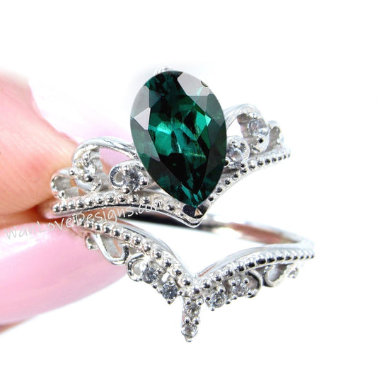 Emerald Diamond Pear Engagement Ring, V Contoured Wedding Band Set,Royal Princess, Custom-14k 18k White Yellow Rose Gold-Platinum