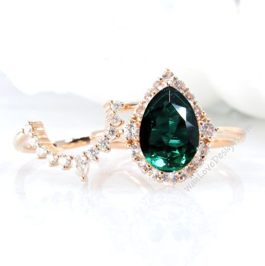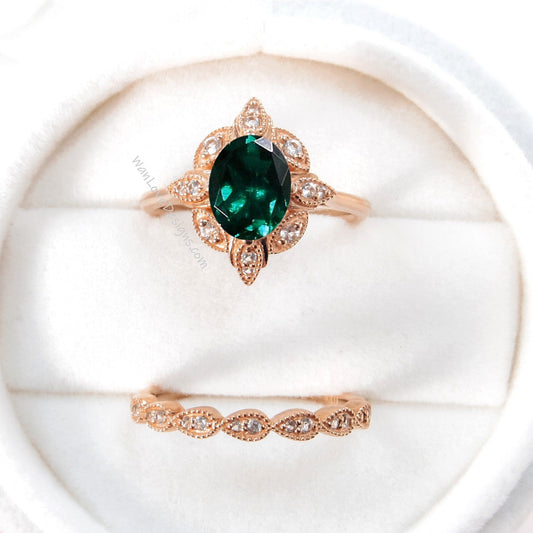 Oval Emerald engagement ring set Rose gold Halo vintage engagement ring Pear Half eternity Diamond ring Bridal Anniversary gift