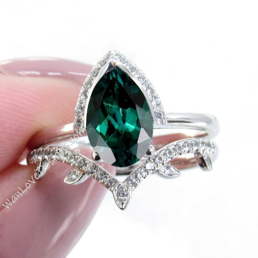 Emerald Pear engagement ring set art deco semi bezel half halo white gold engagement ring women leaf curve Diamond wedding Bridal Band