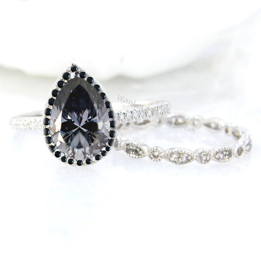 Gray Moissanite Black Diamond Pear Halo Engagement Ring Set, Almost Eternity Milgrain Leaf Band 14k 18k White Yellow Rose Gold-Custom