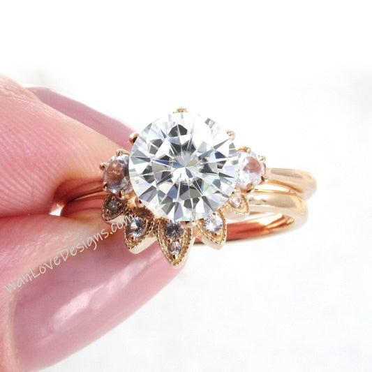 Moissanite Engagement Ring Set, 3 gemstone, Round,Pear, Nesting Wedding Band, 2ct-8mm-3mm-14k 18k White Yellow Rose Gold-Platinum-Custom