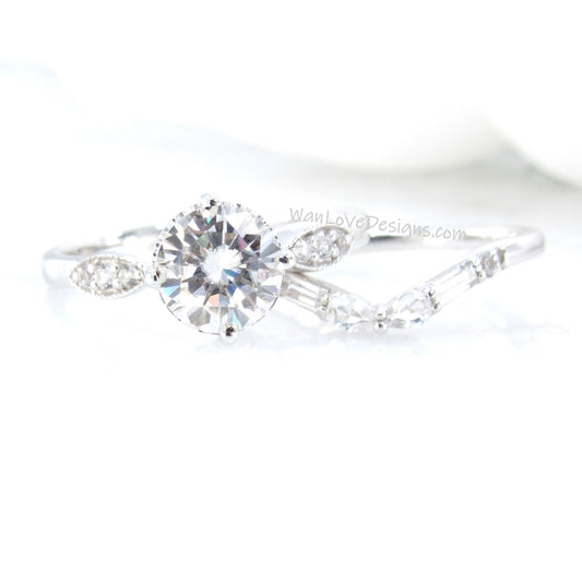 Moissanite Engagement Ring Set | White gold ring Art deco wedding set | Curved baguette pear wedding band bridal set | Anniversary ring