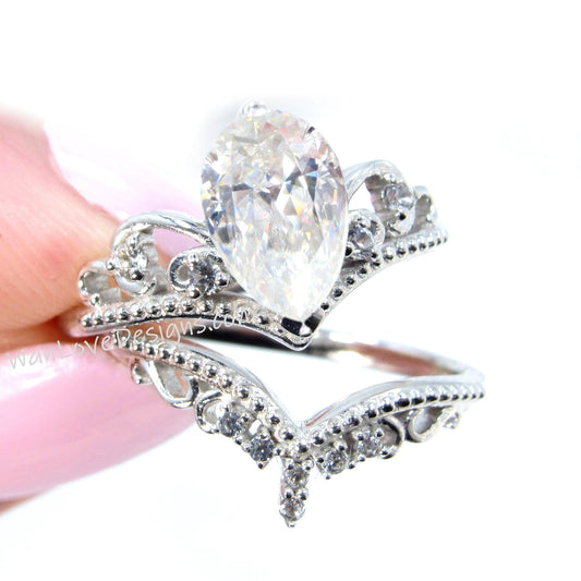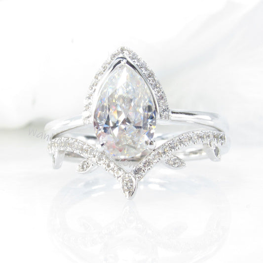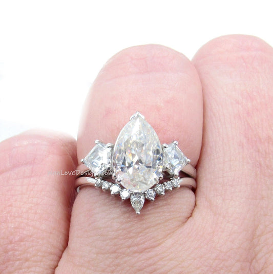 Moissanite Pear Engagement Ring, V Contoured Wedding Band Set, Royal Princess, Custom-14k 18k White Yellow Rose Gold-Platinum
