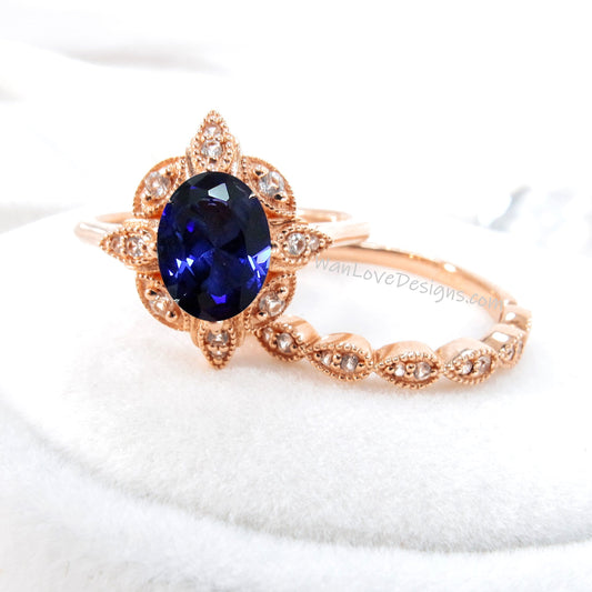 Oval Blue Sapphire engagement ring set Rose gold Halo vintage engagement ring Pear Half eternity Diamond ring Bridal Anniversary gift
