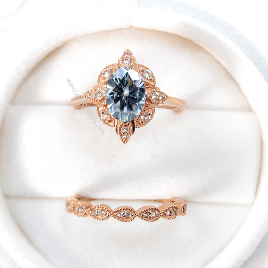 Oval Gray Moissanite engagement ring set Rose gold Halo vintage engagement ring Pear Half eternity Diamond ring Bridal Anniversary gift