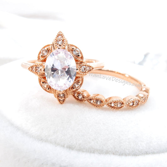 Oval Light Pink Sapphire engagement ring set Rose gold Halo vintage engagement ring Pear Half eternity Diamond ring Bridal Anniversary gift