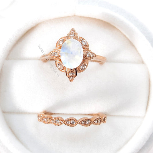 Oval Moonstone engagement ring set Rose gold Halo vintage engagement ring Pear Half eternity Diamond ring Bridal Anniversary gift