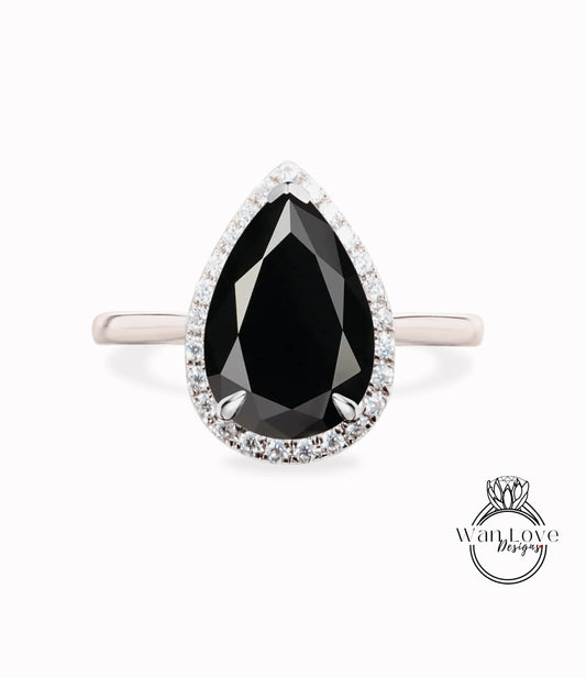 Black Spinel & Diamond Pear Halo Engagement Ring,Plain Shank, Custom-14k 18k White Yellow Rose Gold-Platinum, WanLoveDesigns