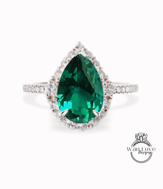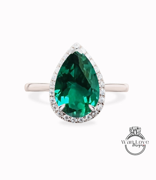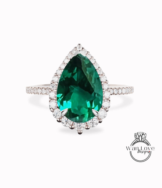 Emerald & Diamond Pear Halo Engagement Ring, Plain Shank, Custom, 14k 18k White Rose Yellow Gold, Platinum, Anniversary Gift, WanLoveDesigns