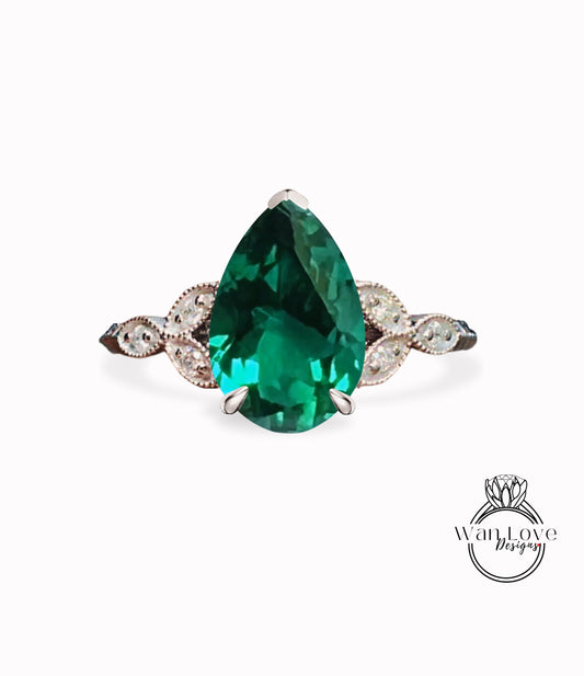 Emerald & Diamond Pear Leaf Antique Cluster Engagement Ring Engraved Milgrain or Smooth 14kt 18kt Gold Platinum Custom Wedding Anniversary