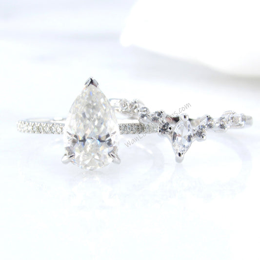 2PCS Moissanite engagement ring white gold Pear shaped Unique Cluster vintage ring vintage Marquise curved nesting wedding band Promise gift
