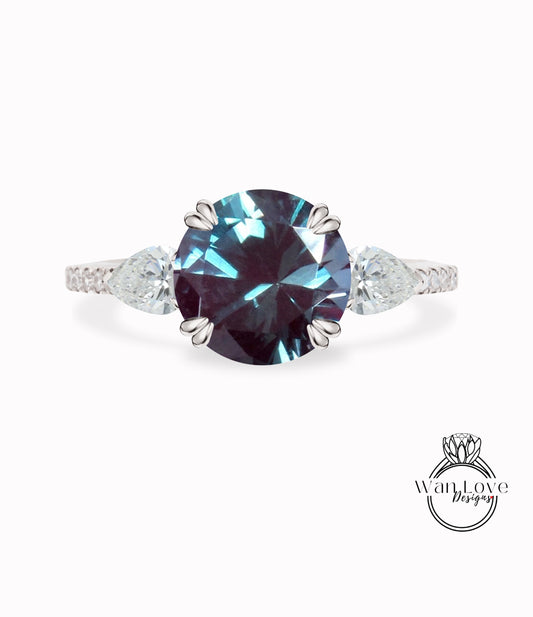 Alexandrite Round Pear Diamond Ring, Three Stone Moissanite Ring, Round color change engagement Ring, Diamond Band Ring
